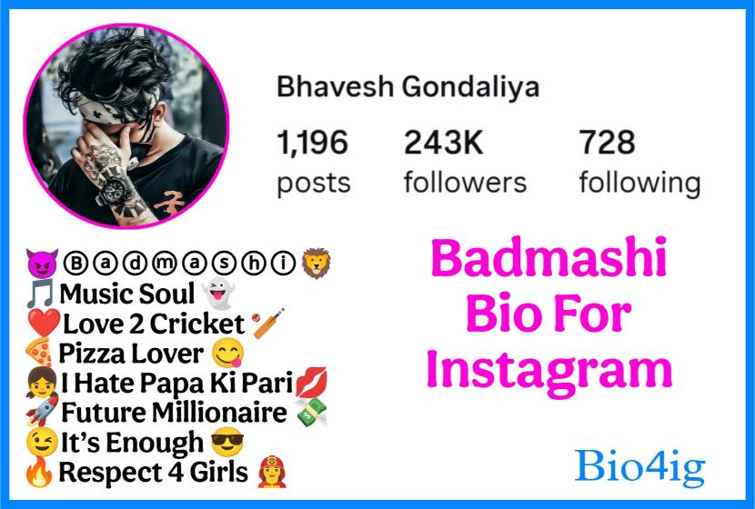 अगर आपको अपने इंस्टाग्राम बायो के लिए एक एटीट्यूड और स्टाइलिश Badmashi Bio For Instagram For Boy चाहिए तो इस लेख को अंत तक जरूर पढ़ना। यहां पर आपको सबसे बेहतरीन और स्टाइलिश Attitude Badmashi Bio मिलेंगे जो आपके इंस्टाग्राम बायो में सबसे ज्यादा अच्छे और परफेक्ट दिखेंगें। यहां पर मैंने वो सभी Badmashi Bio दिए हैं जिसकी आपको तलाश है।