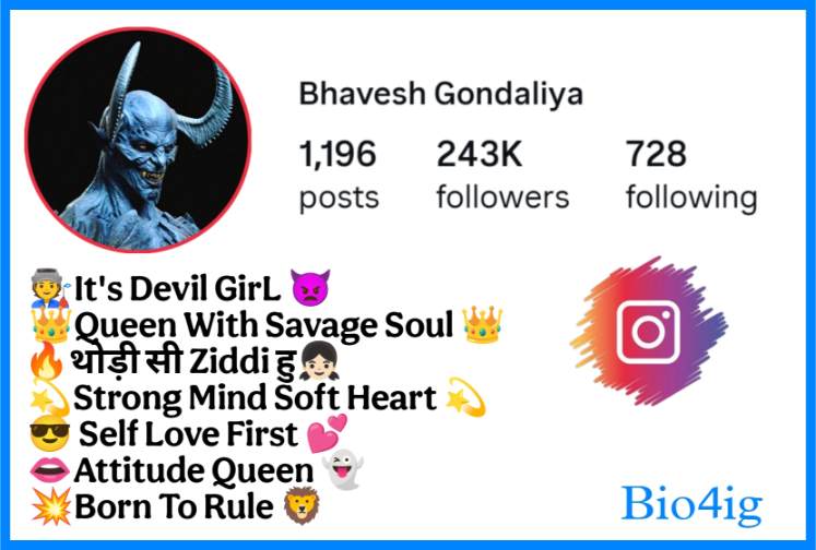 अगर आपको अपने इंस्टाग्राम बायो के लिए एक एटीट्यूड और स्टाइलिश Devil Bio For Instagram For Boy चाहिए तो इस लेख को अंत तक जरूर पढ़ना। यहां पर आपको सबसे बेहतरीन और स्टाइलिश Devil Bio मिलेंगे जो आपके इंस्टाग्राम बायो में सबसे ज्यादा अच्छे और परफेक्ट दिखेंगें। यहां पर मैंने वो सभी Bios दिए हैं जिसकी आपको तलाश है।